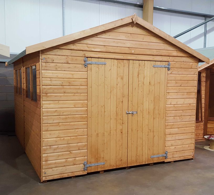 Our sheds are built using panels with a strong internal frame and exterior cladding. This ensures durability, stability, and a neat finish. The sheds unless requested are sprayed with a "Travel Coat" of preservative. This protection is designed to give customers time to fully treat their shed with a suitable timber treatment. We recommend that you treat your shed within 6 months with a high quality treatment. We recommend and supply Sadolin through our shop. In some areas we are also able to quote for the full painting service of your shed. Please ask our team.