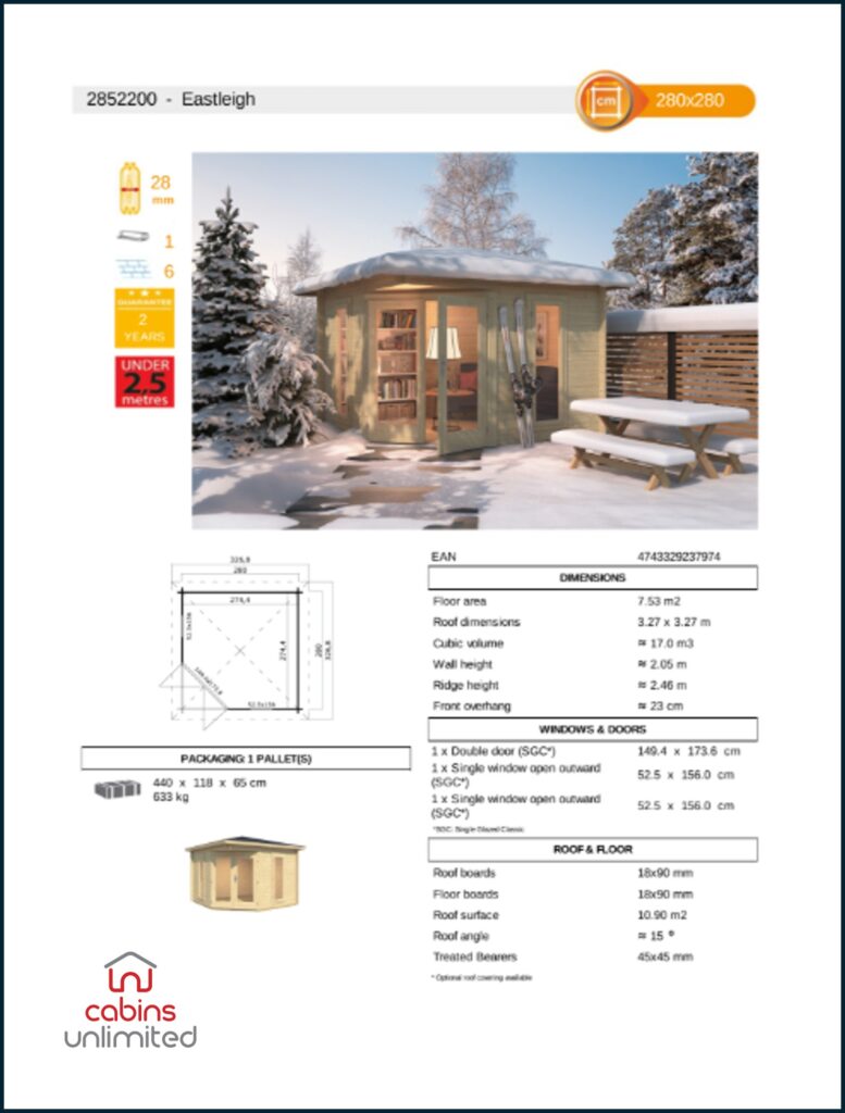 This building features 28mm interlocking timber walls, which makes it lighter and more budget-friendly compared to some thicker-walled cabins, while still offering the durability expected from a quality timber structure. If you’re looking for a compact yet stylish space to relax, read, or enjoy a morning coffee, the Eastleigh is an ideal choice.
