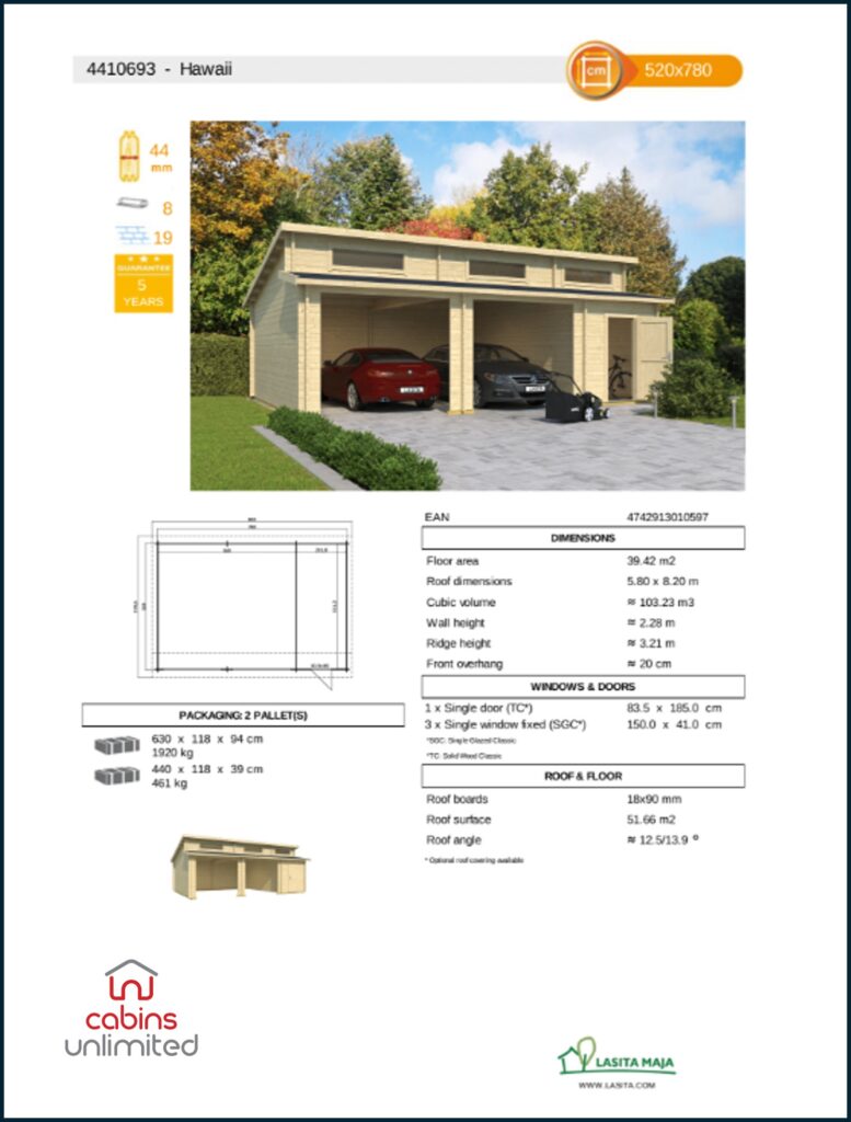 The Hawaii is a uniquely designed garage model with loads of space to store vehicles as well as a separate side storage shed. The solid timber door supplied with the garage can be fitted into the front wall outside side wall or can be fitted as an inside room making the storage accessible from the inside.