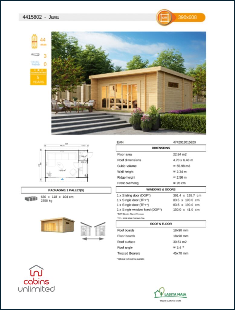 Made from 44mm interlocking logs, the Java is both sturdy and efficient. Double glazing comes as standard for better insulation and year-round comfort. Moreover, the building’s clean lines and modern design make it a great fit in any garden.