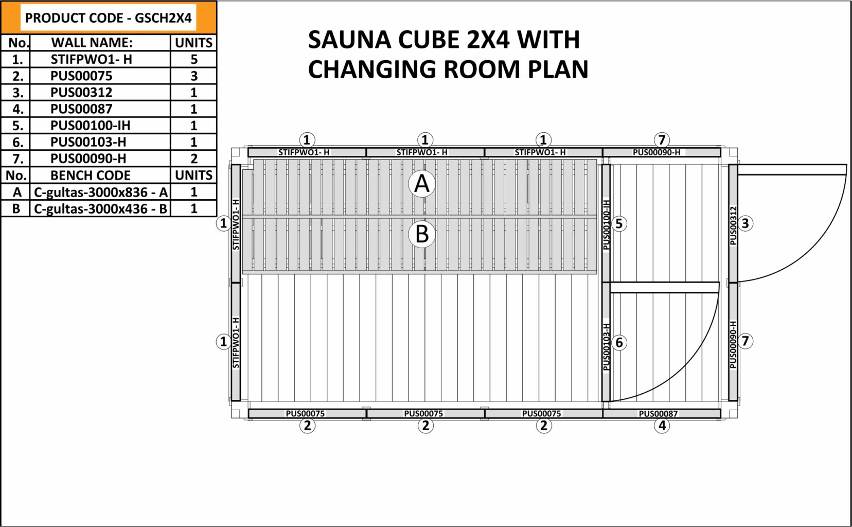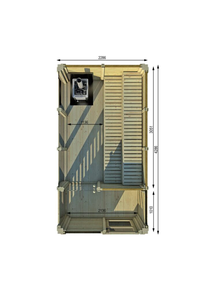 • 1 insulated partition wall with glass sauna doors;